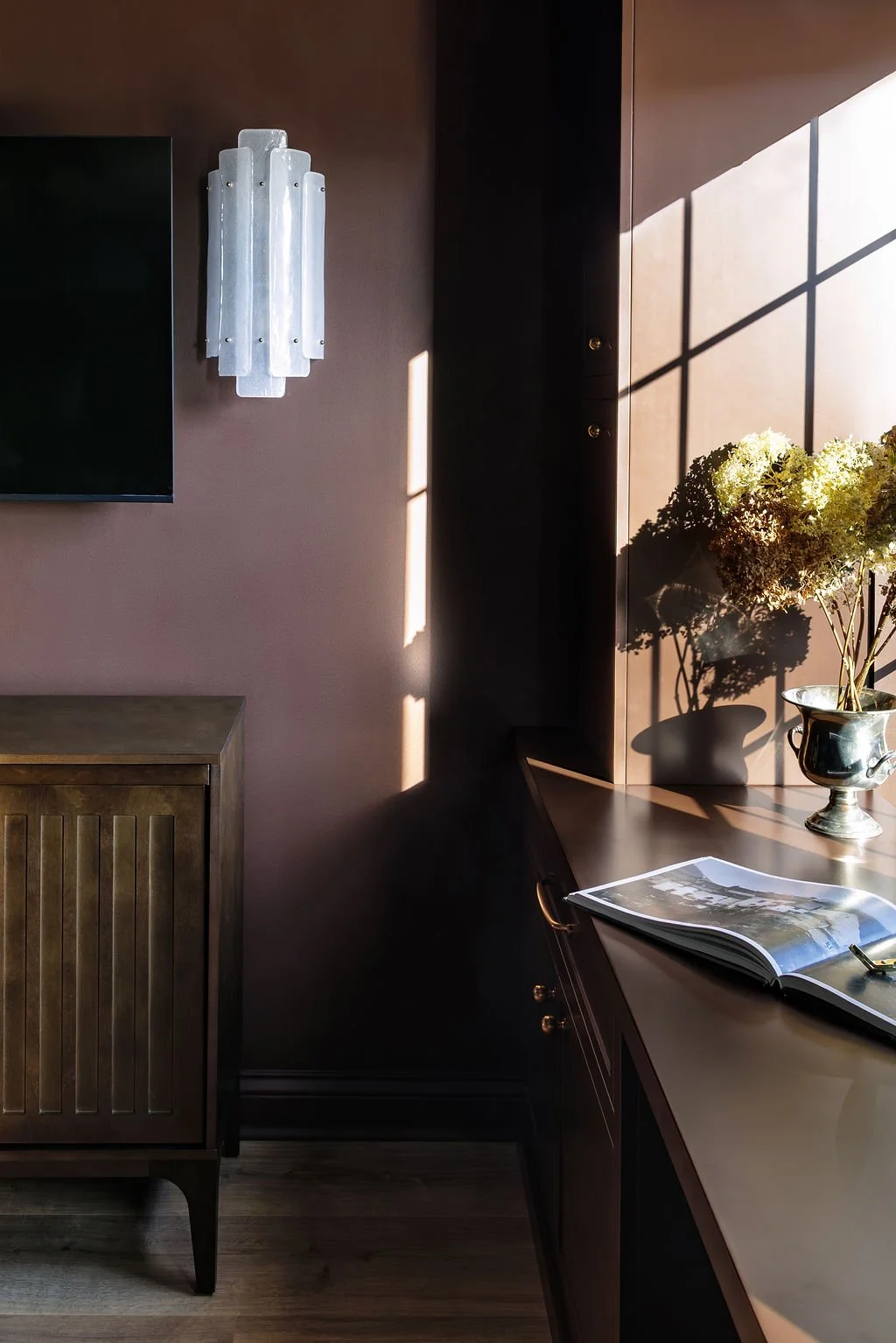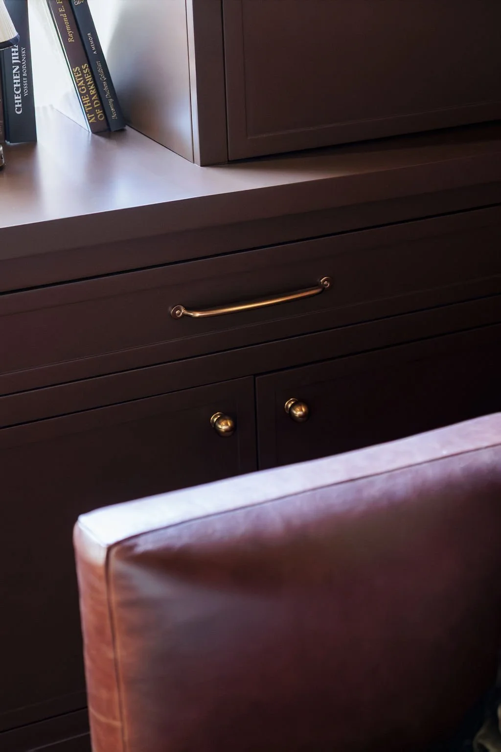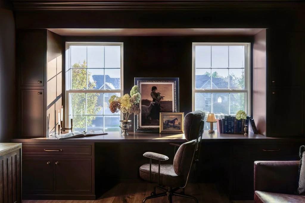 Formerly a guest bedroom, this space was reimagined as a moody office, designed to feel more like a gentleman’s den than a traditional workspace.